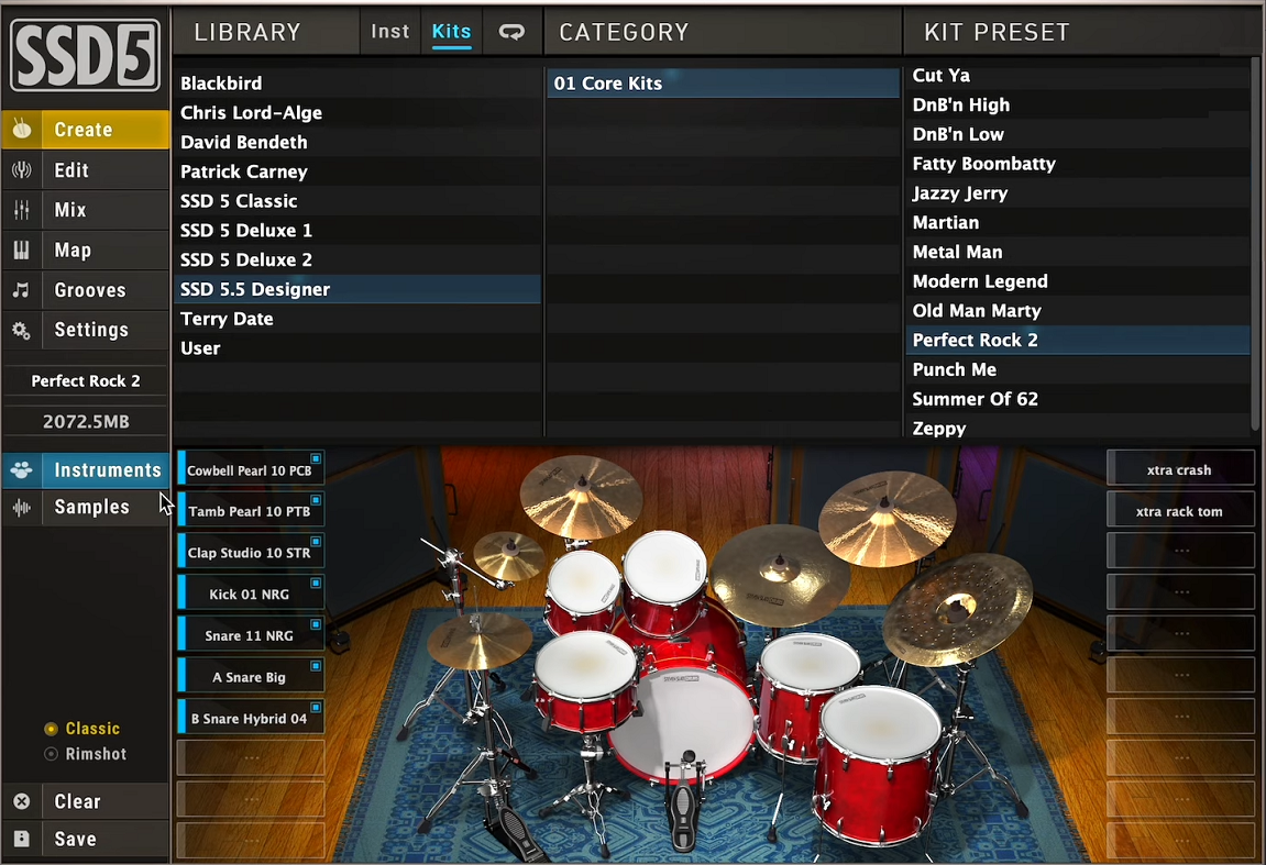 This is where SD3 flexes, as 6 full acoustic kits, tons of snares and kicks, 3 rooms from Galaxy, close mics, overheads, and a huge choice of ambience channels, including enough material for 11.1 surround.