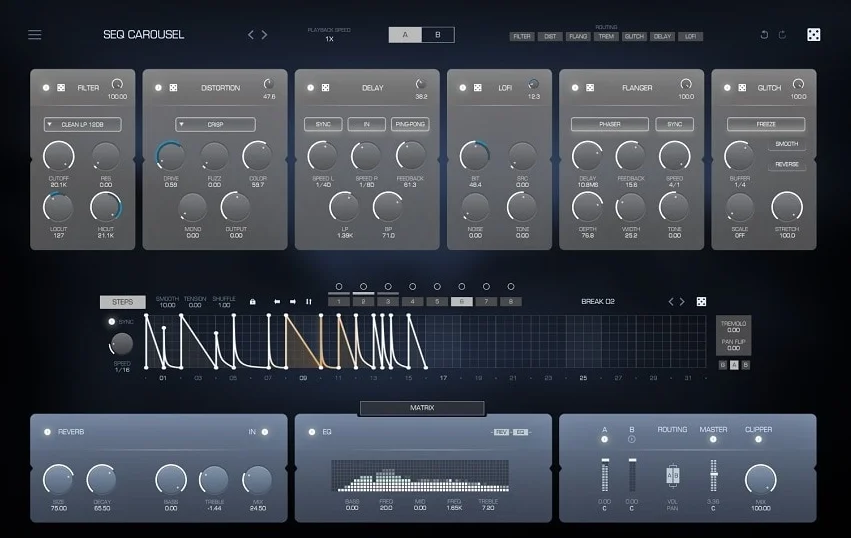 Getting into the plugin itself, I immediately appreciated the dual signal chains, A and B, each with six dedicated effects modules: Filter, Distortion, Delay, LoFi, Flanger, and Glitch.